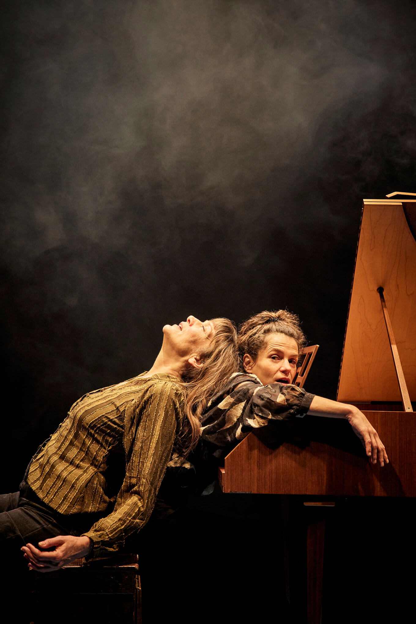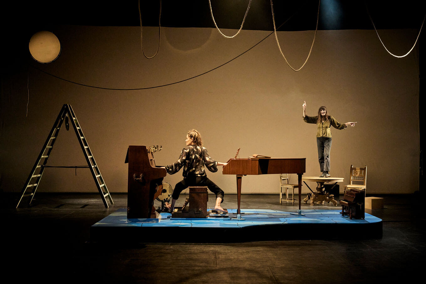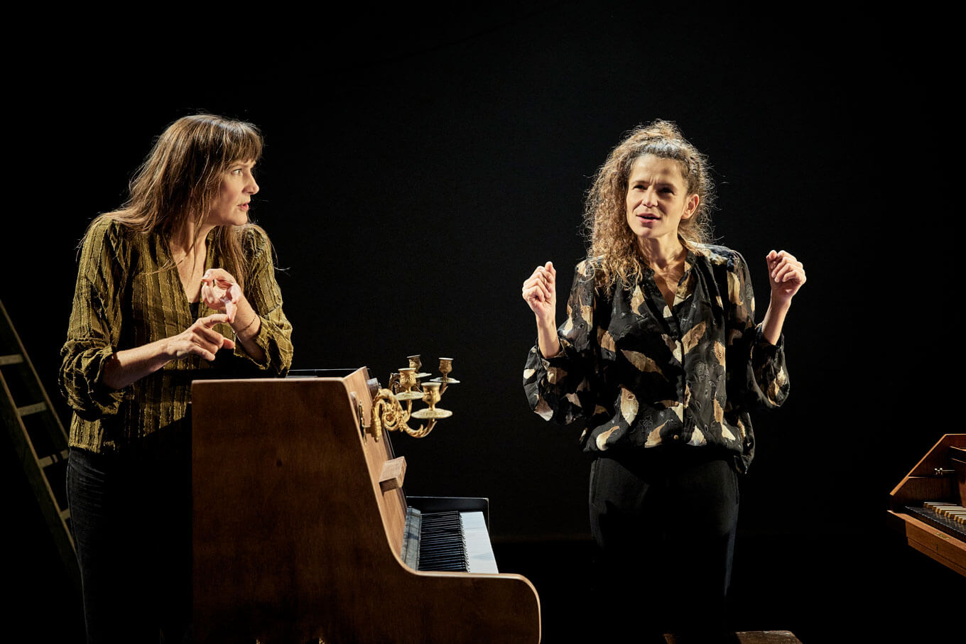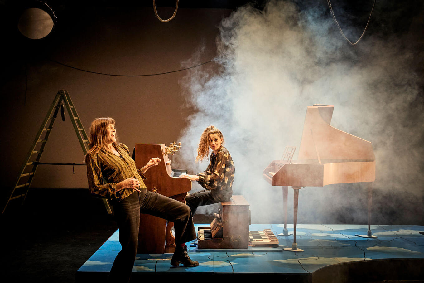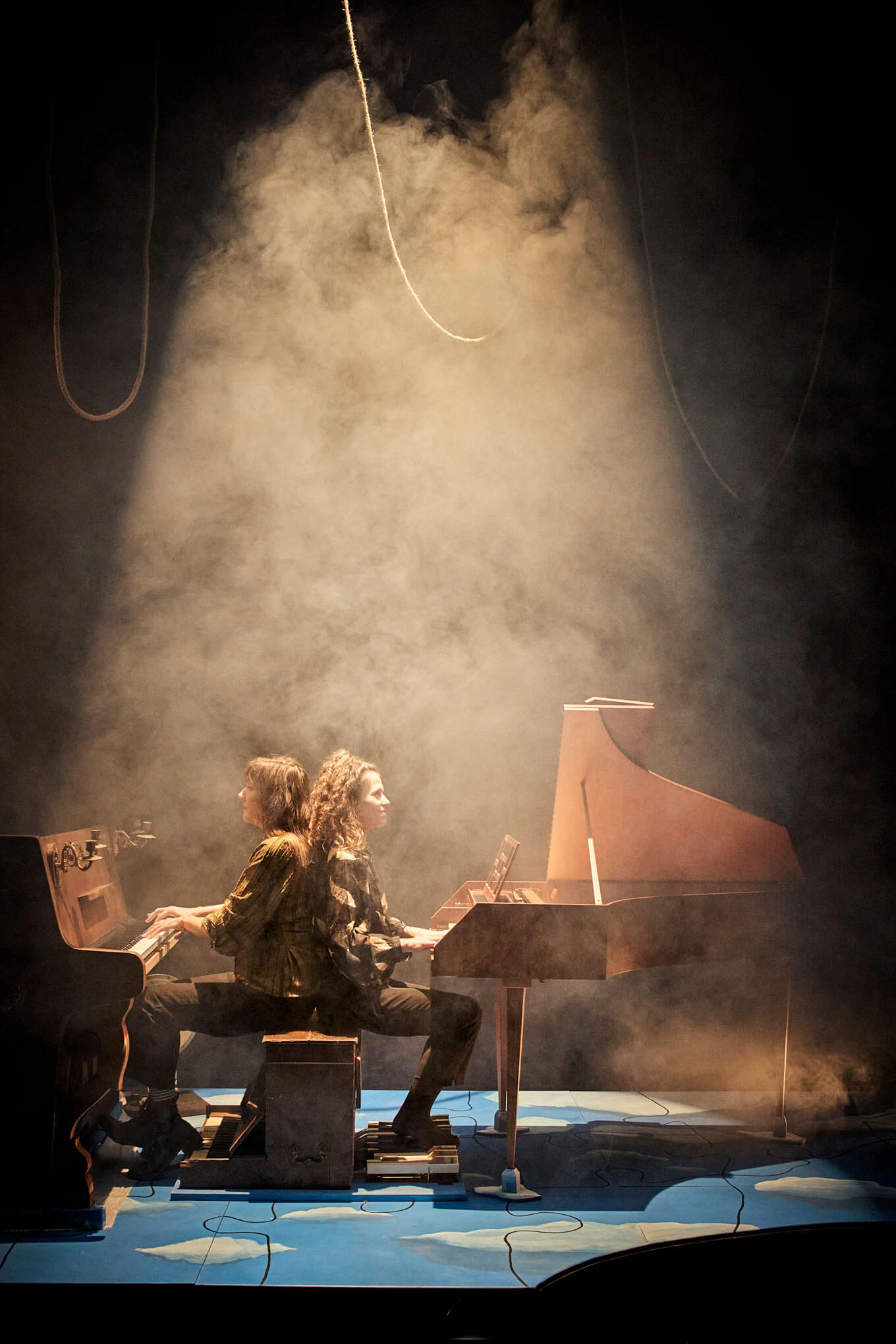 Sur scène deux filles épatantes. La première, Élise Caron, magicienne de la voix chantée, parlée, ébouriffée. Artiste inclassable et surdouée, elle navigue entre chanson, théâtre et improvisation. La seconde, Jeanne Bleuse, femme-orchestre lumineuse, réinvente l’art des claviers – piano, clavecin, ou tout ce qui sonne – aussi bien sur les grandes scènes que dans sa roulotte itinérante.